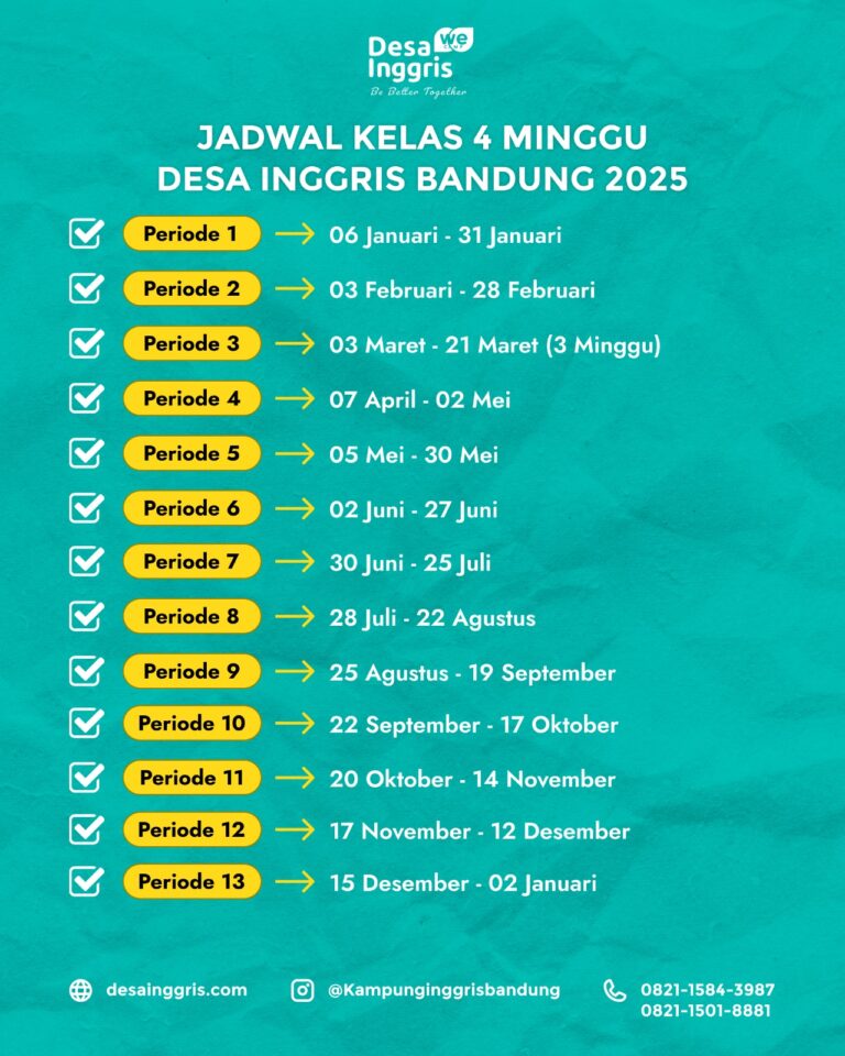 Disclaimer : Hasil pembelajaran setiap peserta dapat bervariasi tergantung pada tingkat usaha, kehadiran, dan komitmen dalam mengikuti program. Desa Inggris menyediakan metode dan lingkungan terbaik, tetapi keberhasilan juga memerlukan kontribusi aktif dari peserta.